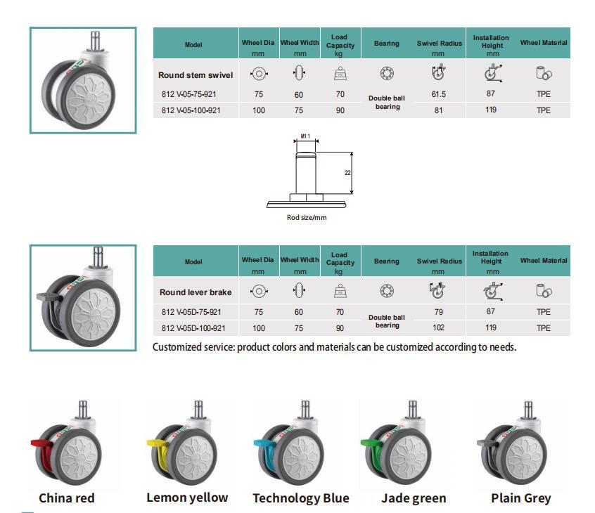 medical equipment caster, Grip ring stem caster, M11*22. 75/100mm wheel diameter